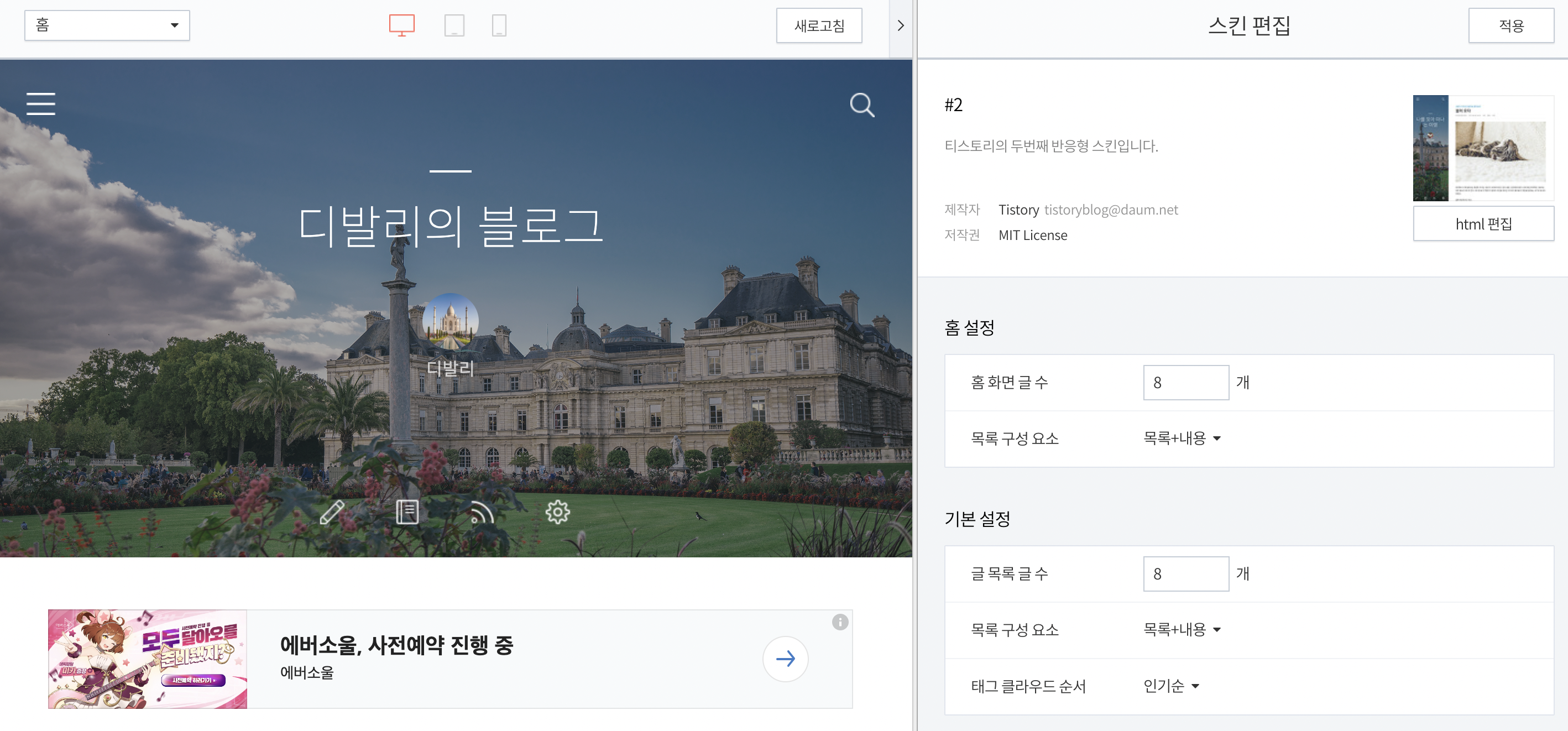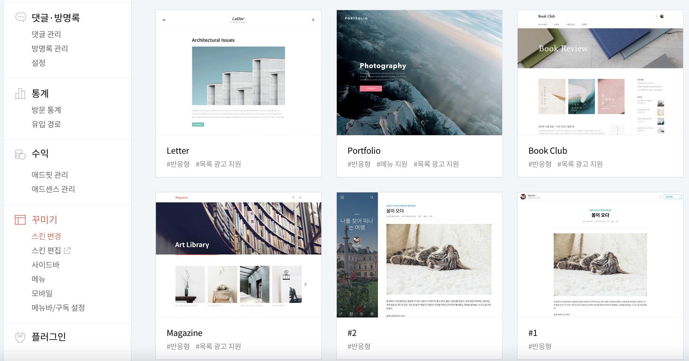 좌측 메뉴의 [스킨 변경]을 누르면 여러가지 스킨이 나오는데 필자는 #2를 사용중이다.