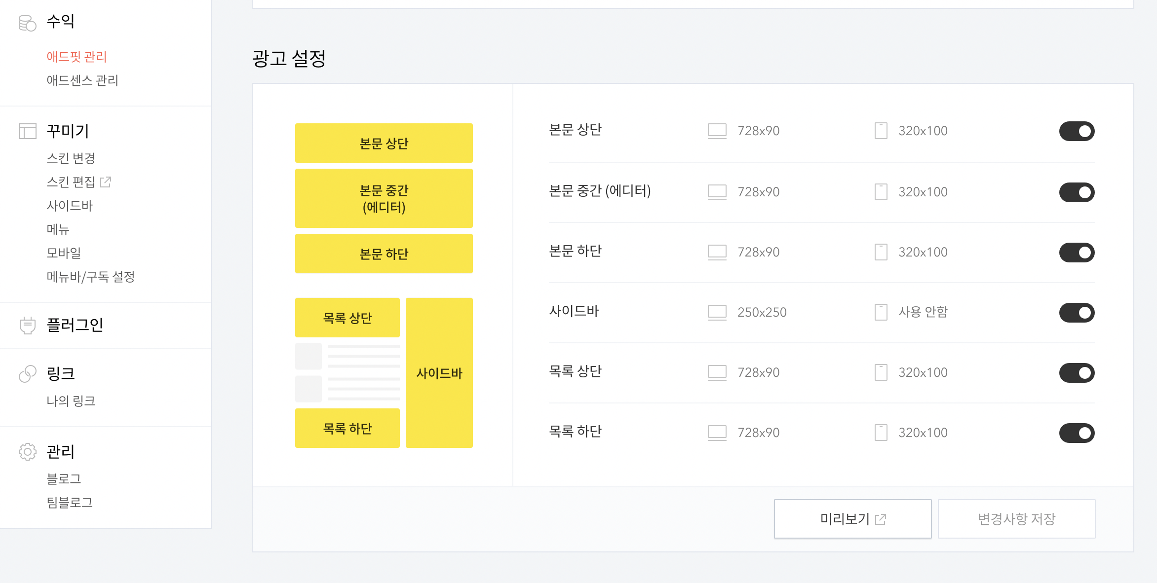위의 사진과 같이 본문상단, 중간, 하단 사이드바 등 여러군데 배너를 넣을 수 있는데